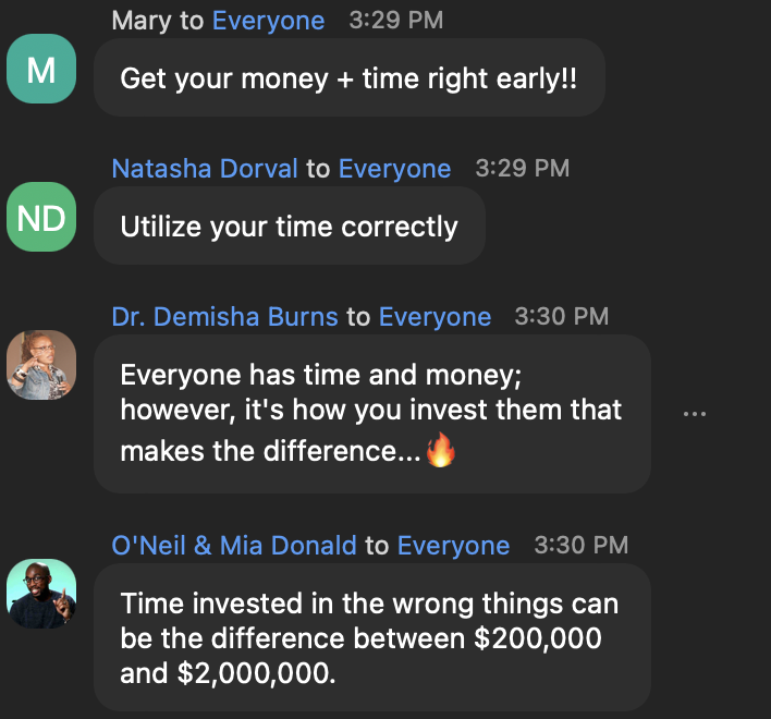 We’ve got you! Many of our attendees are career professionals who want to learn how to think differently about their work so that they are able to make their money work for them and don’t have to continue working as hard as they are indefinitely. Plus being in the room with and learning from millionaires will only serve you in your personal financial goals and not limit you. It will expand the way you are currently thinking.